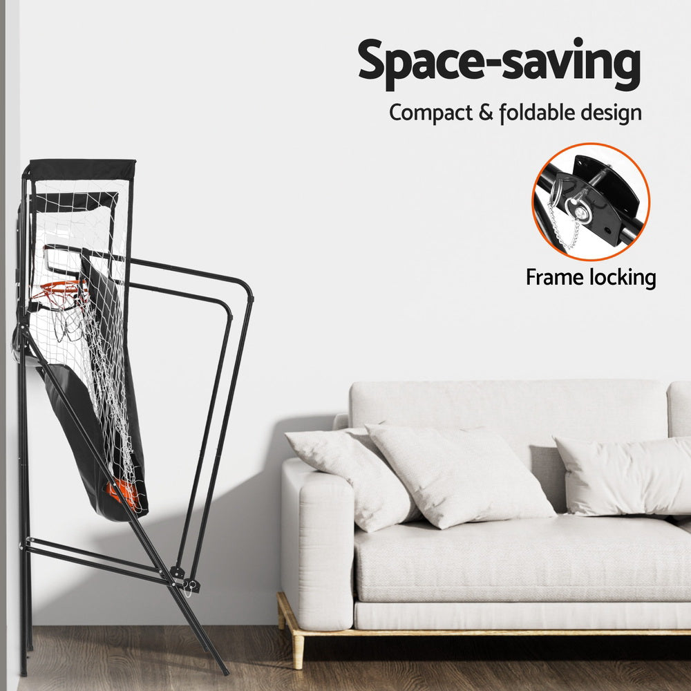 Bring the thrill of the arcade home with your very own Basketball Shooting Machine. The game is made from quality coated steel tubes that are rust-resistant as well as a waterproof and stain-resistant printed polyester fabric that is sturdy and durable, so you can use it indoors or outdoors. Realistic sound effects make you feel like you’re at your local arcade hotspot. The LED automatic score counter provides an accurate and impartial referee for two players, no fighting on the courts! The high net catches stray balls and returns them quickly and easily so you can get back to fun. The triangle frame design, secure lock and anti-slip feet always keep the game stable. With a foldable, portable and easy-to-assemble Velcro design, you can play basketball in minutes, whether at home or on the road. Includes two additional basketballs so you can keep shooting for the stars, no interruptions! Game on to victory with your very own arcade-style Basketball Shooting Machine.