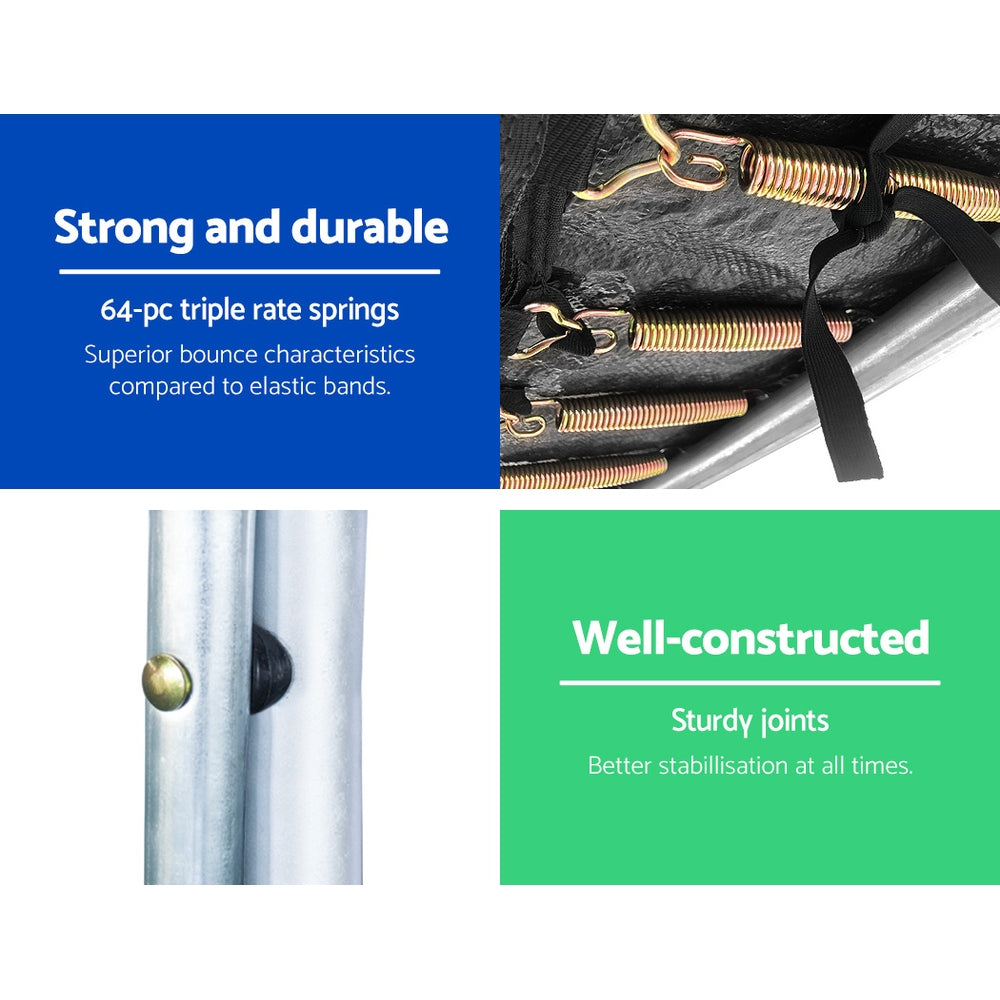 Bounce to your heart's content with the Trampoline. With its superior bounce characteristics featuring 64-piece triple rate springs, the 10-foot Trampoline enables safe and durable bouncing with no worries. The heavy-gauge steel framework is designed to handle all robust play and is UV-tested for quality and reliability. Other great features include a curve design for more rigidness, 20mm thick padding, anti-graze mat, safety netting and a double-lock zip-and-clip entry. Not least, the included basketball hoop, basketball and pump really adds an awesome fun factor to the entire ensemble. So jump to it and order the Trampoline today.