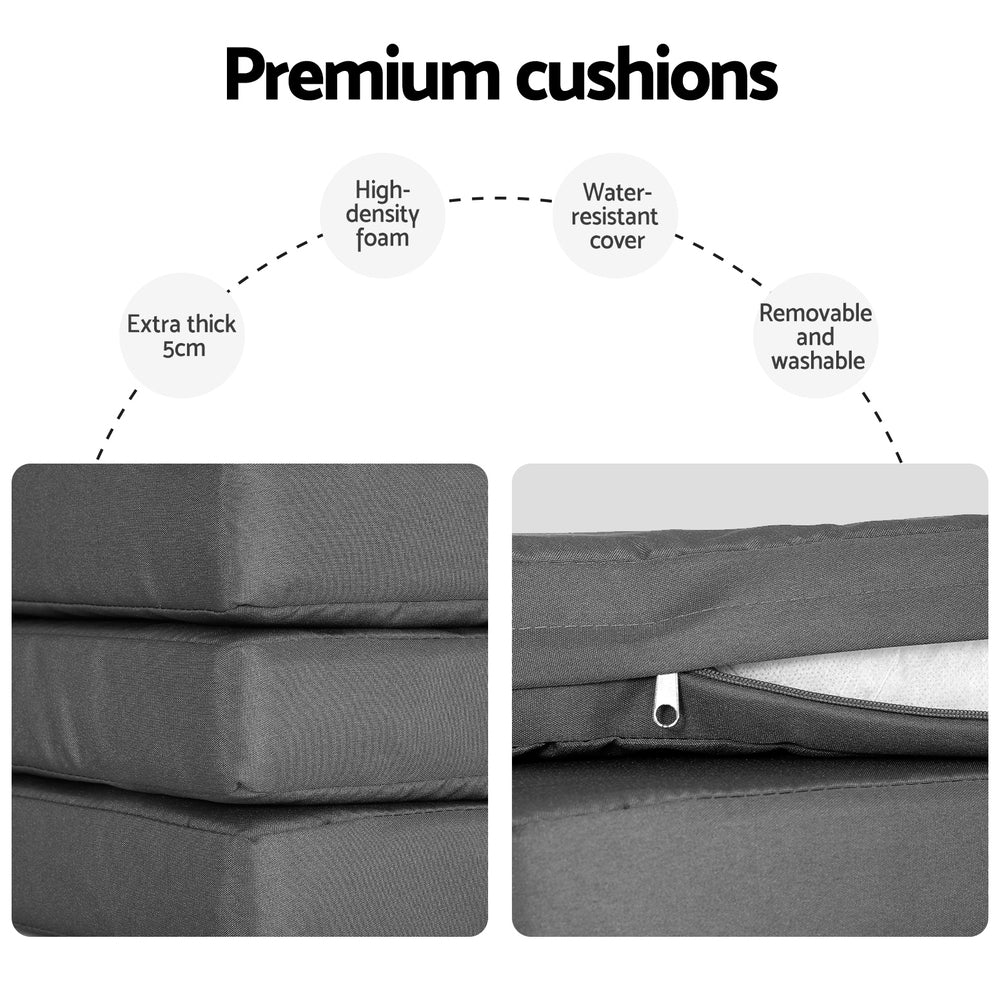 Experience the best the outdoors has to offer with this Gardeon 9-piece Outdoor Setting. Featuring eight single chairs and a matching dining table, this set is perfect for sitting outside and watching the world go by in comfort and style. The set is made using powder-coated steel and meticulously hand-woven rope for rust and water resistance, while the removable outdoor cushions feature water-resistant fabric and thick 5cm high-density foam for comfort. The chairs have a slanted backrest and handrails to keep guests comfortable for hours on end. It is easy to assemble and features non-slip feet to keep everything in its place. The dining table features a stylish tempered glass tabletop that is gorgeous to look at, easy to maintain and generous enough to hold all of your favourite drinks, reading materials or outdoor games. Maintenance is as easy as wiping down the furniture with a damp cloth. So what are you waiting for? Make the most out of the beautiful weather with a Gardeon 9-piece Outdoor Dining Setting.