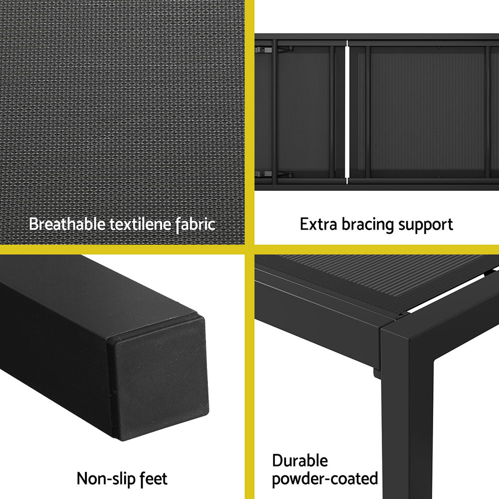 Make the most out of every sunny day with a Gardeon Sun Lounger. Made from breathable textilene fabric on a strong powder-coated aluminium frame, the lounger is sturdy and resistant to weather and corrosion. Non-slip feet and extra bracing support keeps the chair upright and stable with a 150kg weight capacity. 5 adjustable backrest settings offer you the perfect position to rest and relax. Smooth wheels make the chair easy to move and chase the sun. Best of all, the lounger is easily assembled and can be used anywhere such as the beach, the park, poolside or even indoors. Have more fun in the sun with a Gardeon Sun Lounger.