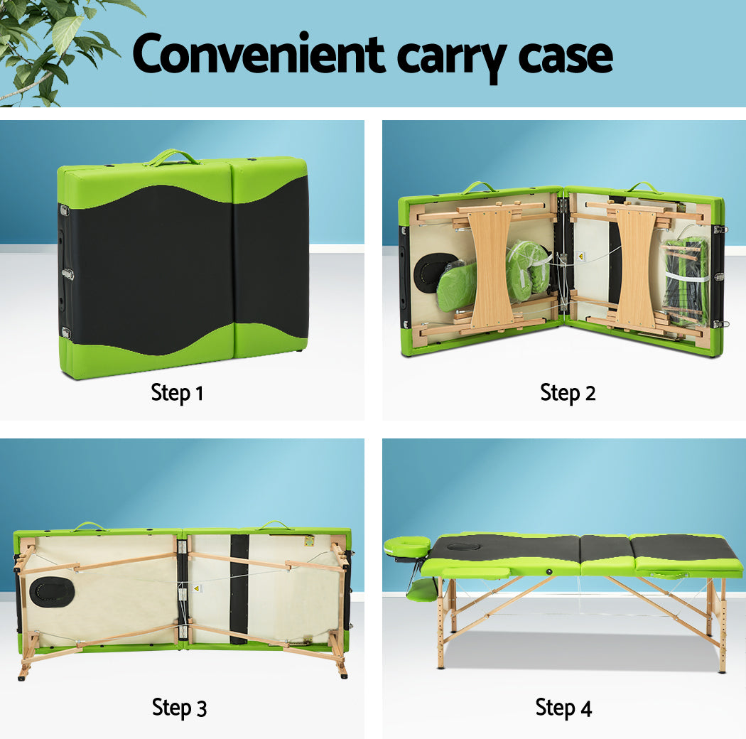 Zenses Massage Table 70cm Portable 3 Fold Wooden Beauty Bed Green